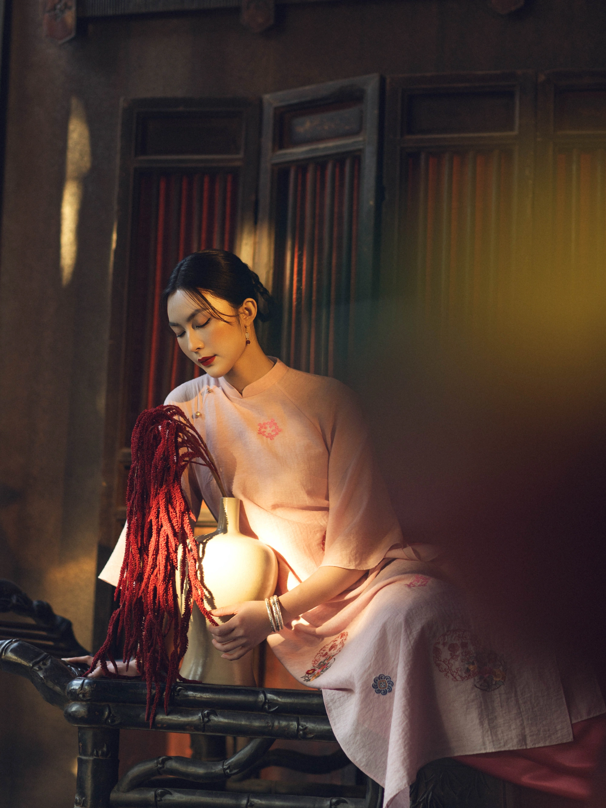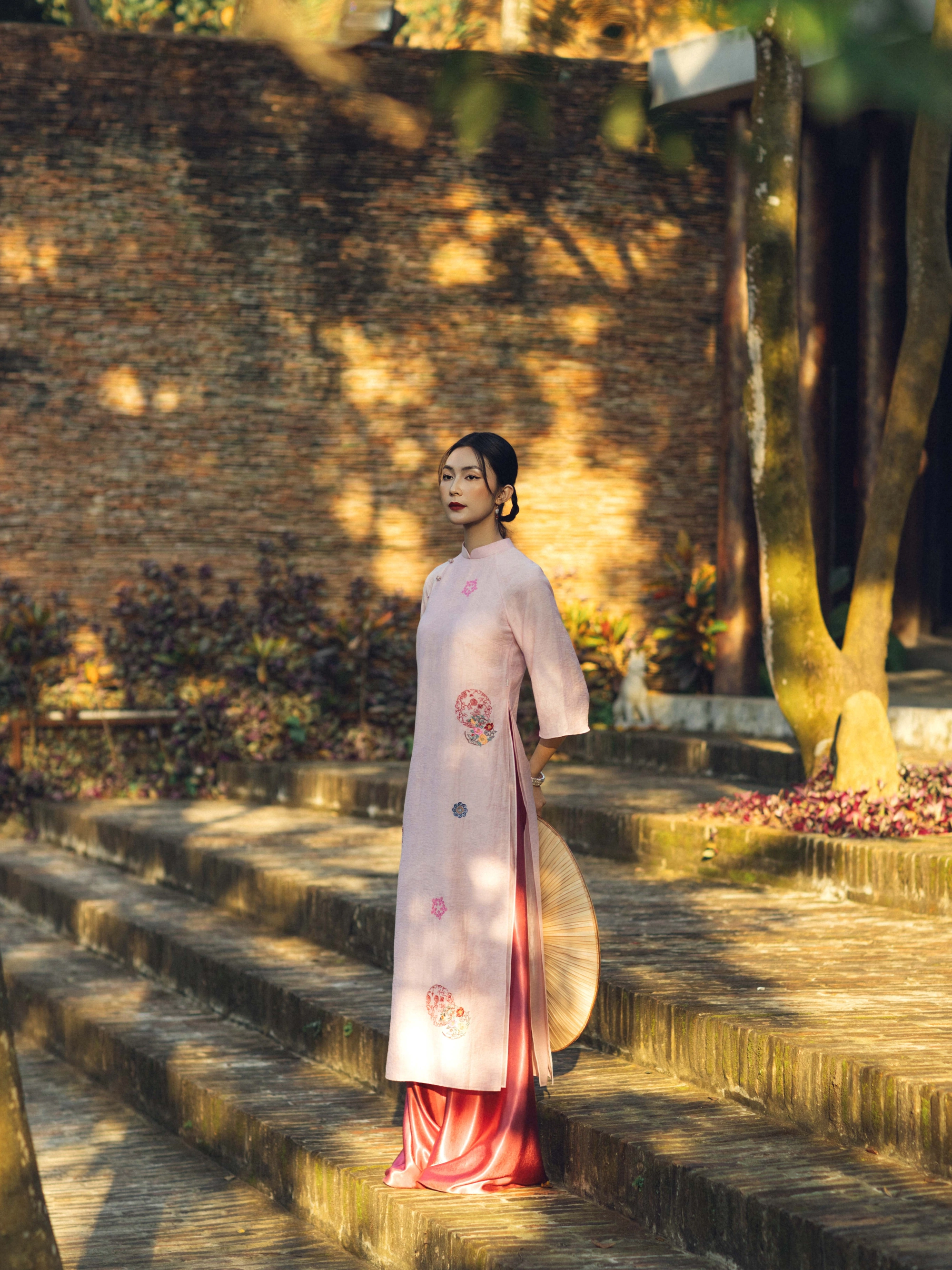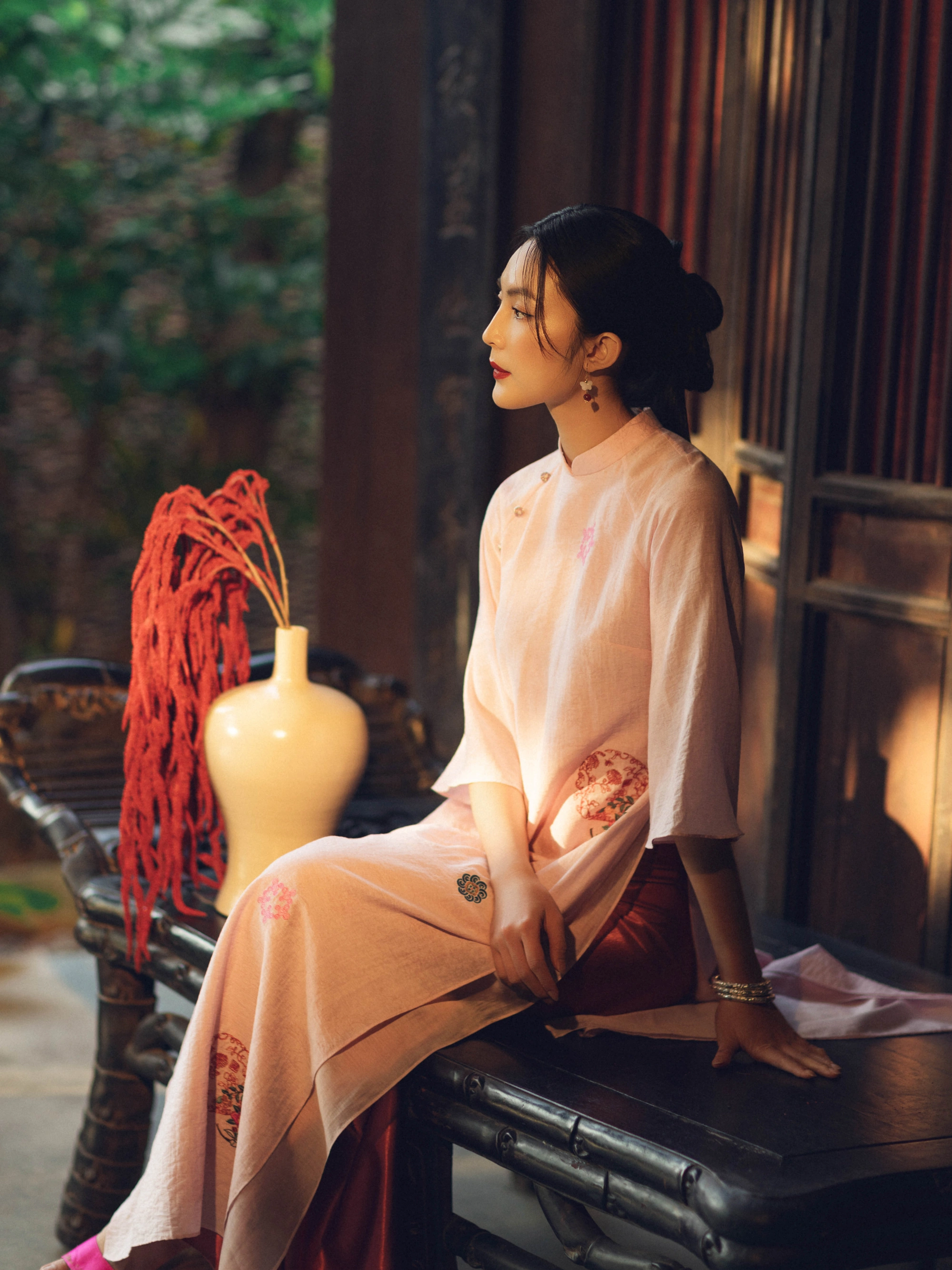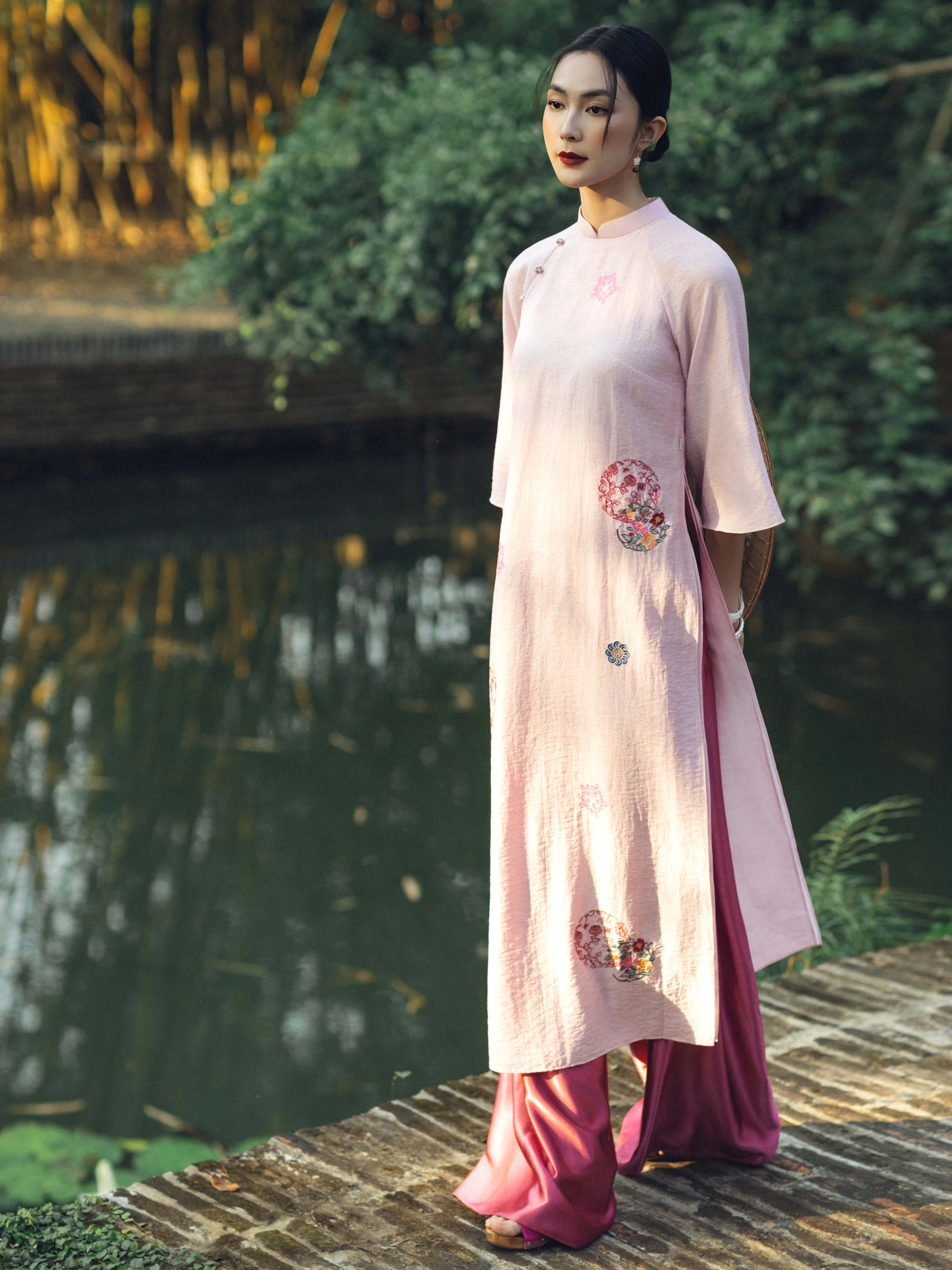 Khoác lên mình sắc hồng phớt và đỏ trầm đầy tinh tế, áo dài Tường Viên được tạo nên từ chất liệu tơ sống mềm nhẹ, giữ trọn vẻ đẹp mộc mạc nhưng vẫn sang trọng. Trên nền vải là những mảng thêu hoa hải đường và hoa cúc trong ô tròn, tượng trưng cho phú quý – an khang – trường tồn.