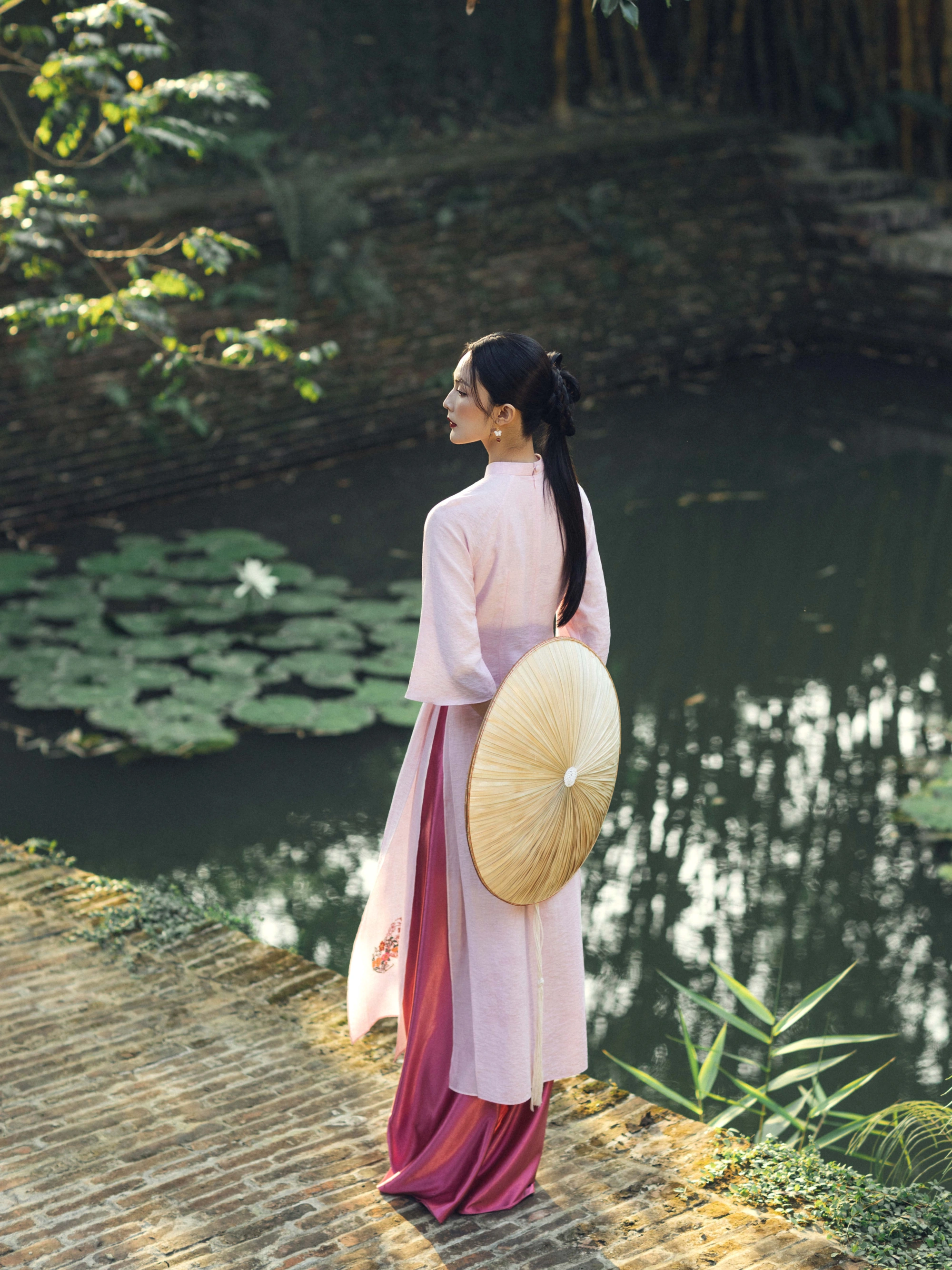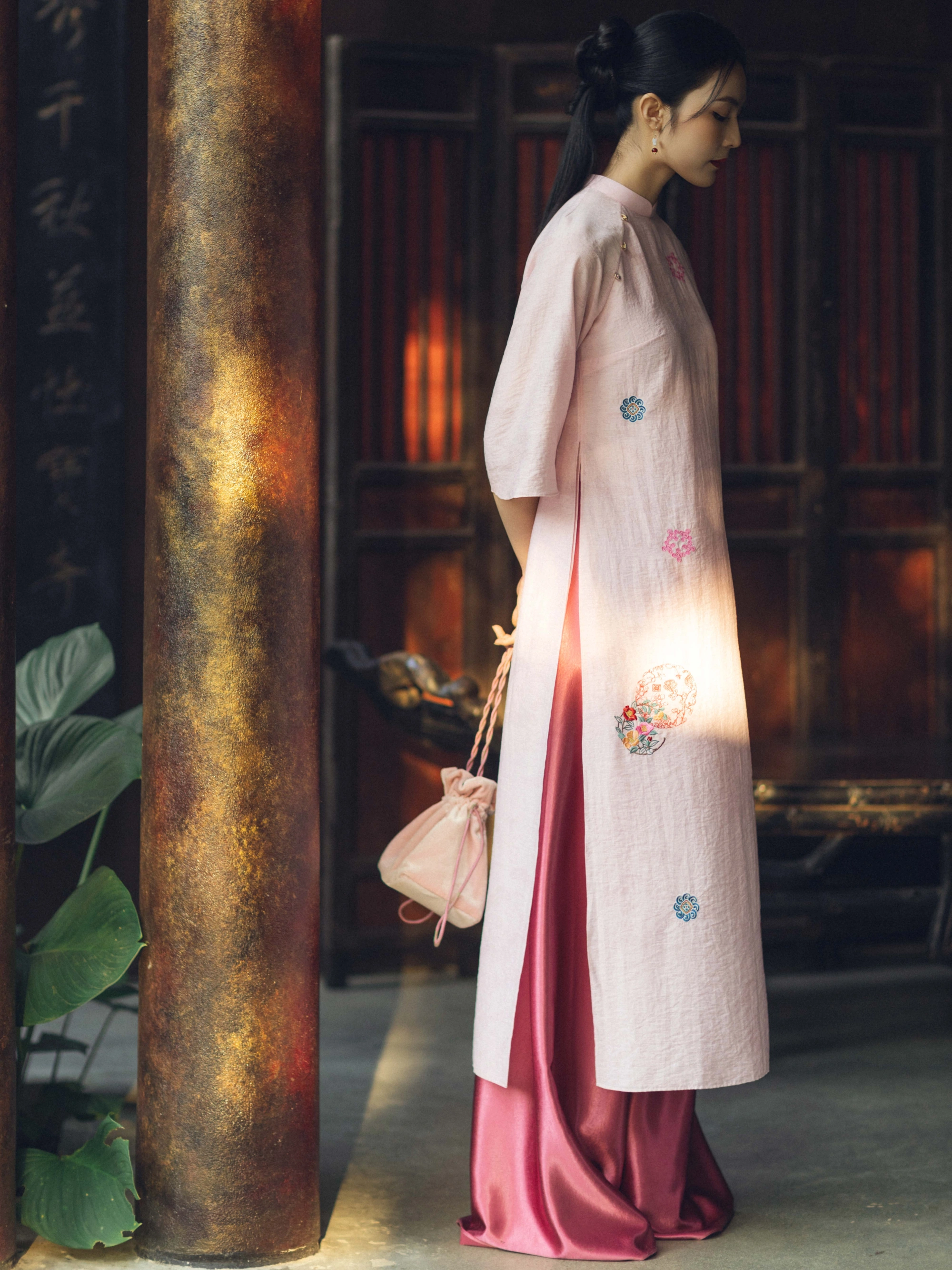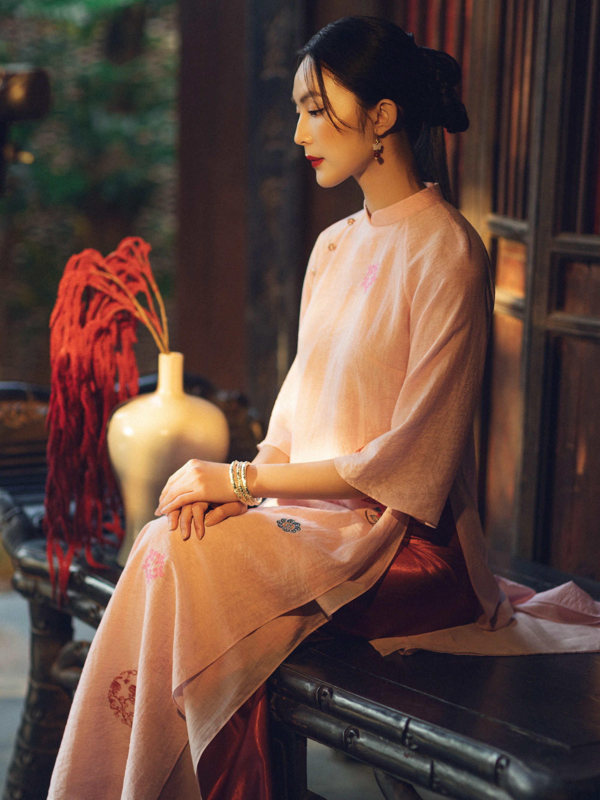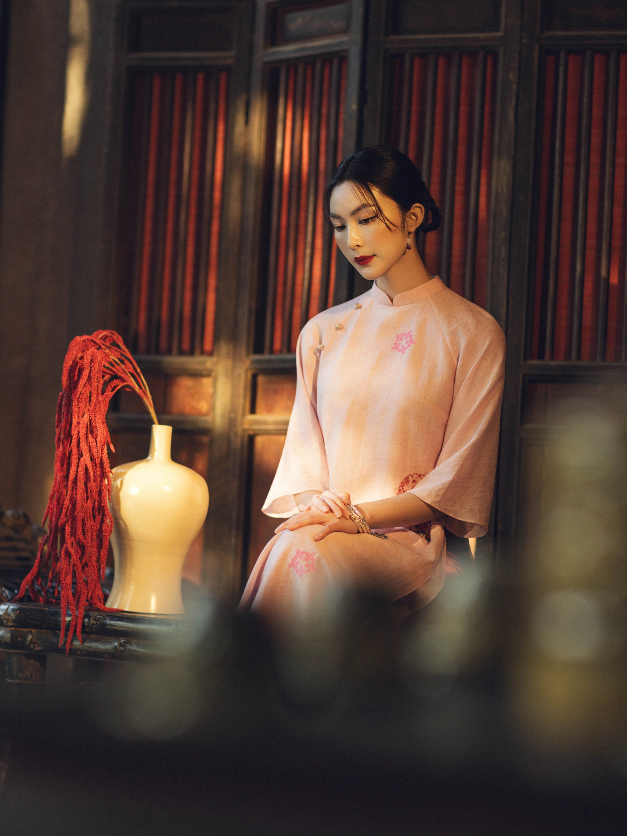 Khoác lên mình sắc hồng phớt và đỏ trầm đầy tinh tế, áo dài Tường Viên được tạo nên từ chất liệu tơ sống mềm nhẹ, giữ trọn vẻ đẹp mộc mạc nhưng vẫn sang trọng. Trên nền vải là những mảng thêu hoa hải đường và hoa cúc trong ô tròn, tượng trưng cho phú quý – an khang – trường tồn.
